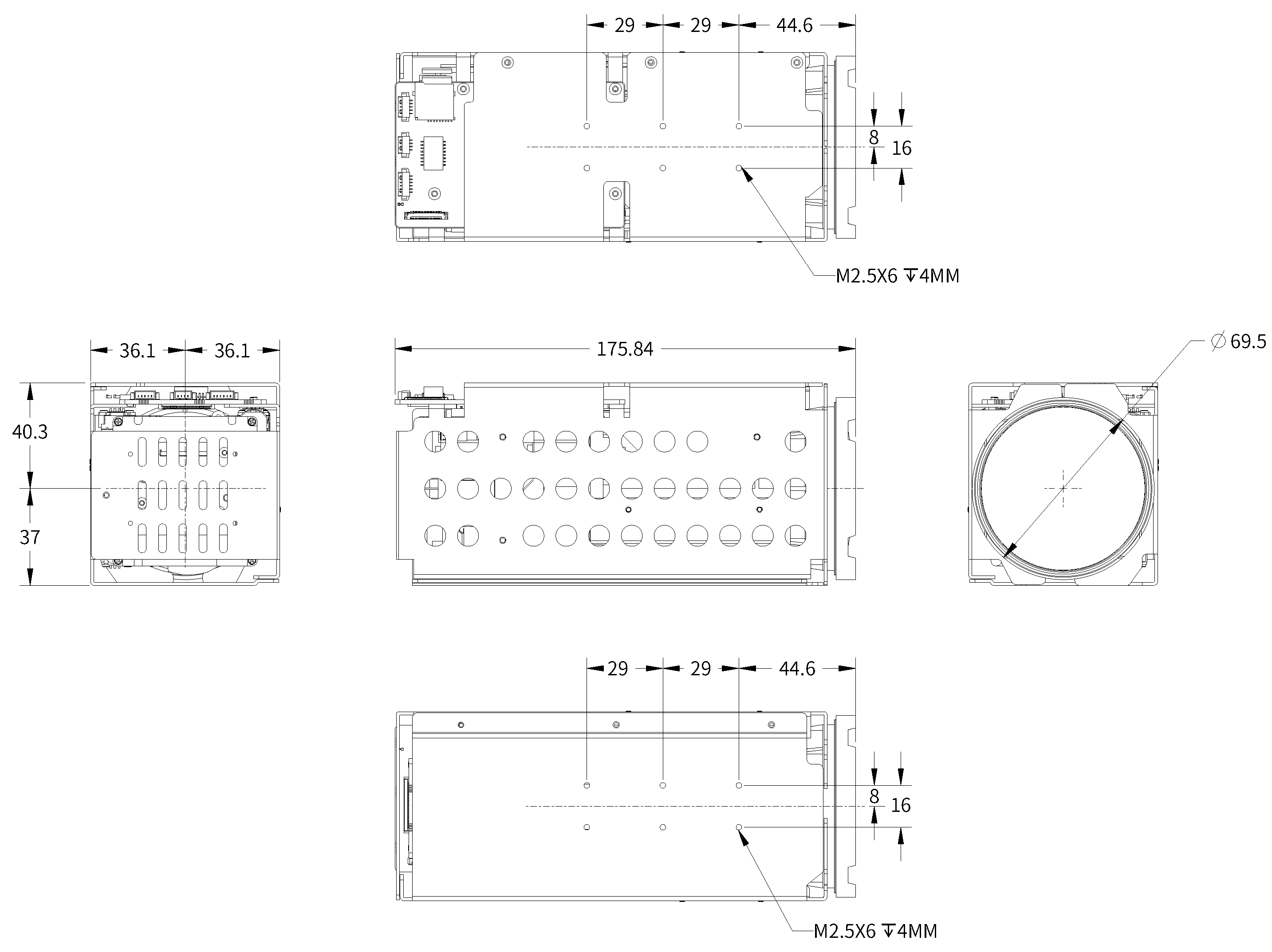 4 핀 이더넷 포트, 6 핀 파워 및 UART 포트, 5Pin 오디오 포트. 30pin mipi |